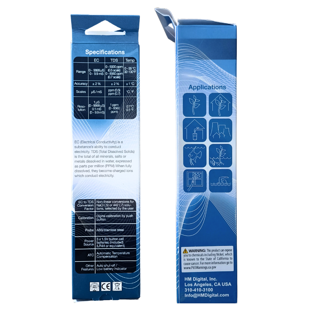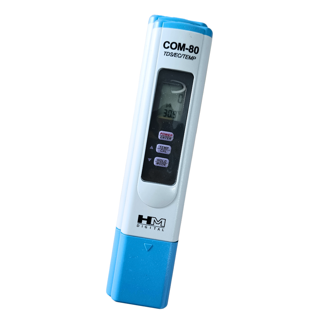 The Hydrotester (HM Digital-COM-80S), is an economically priced, reliable EC/TDS meter that is ideal for testing applications such as hydroponics & gardening, pools & spas, aquariums & reef tanks, water ionizers, drinking water, and more.